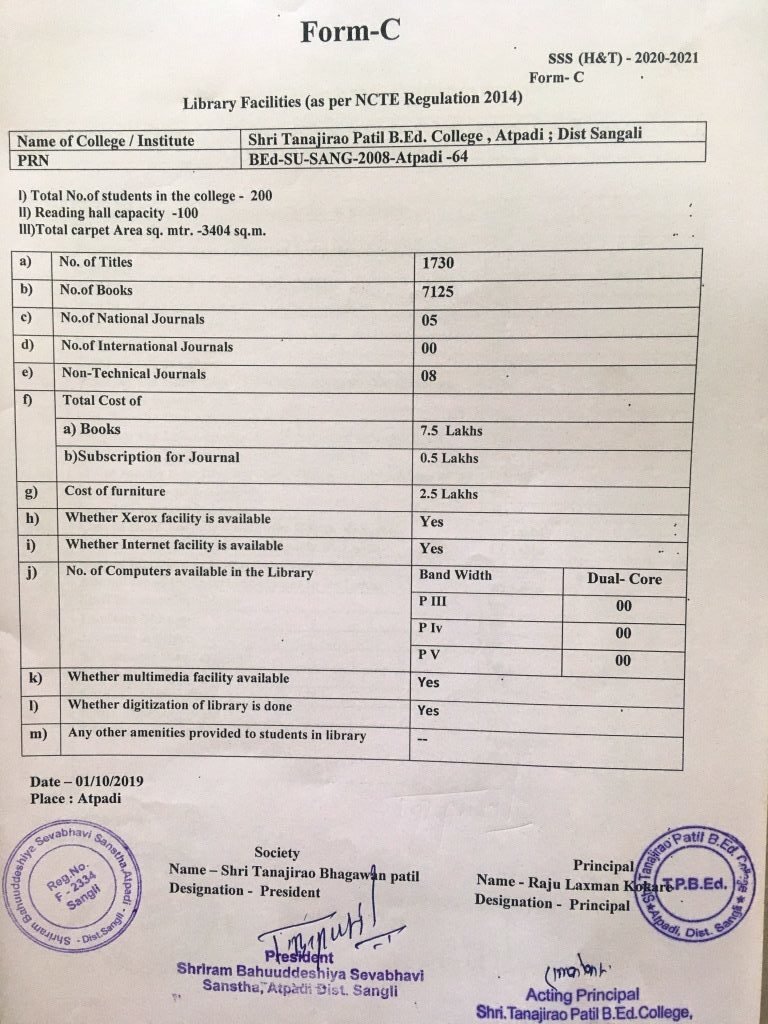 Library of Shri Tanajirao patil B.Ed.College ,Atpadi is equipped to meet essential academic & intellectual needs of the students in various diverse fields. Online access system, e-journals, updated books, novels, spacious reading room provides an atmosphere conductive to study. The library stock consists of more than 18000 books which is regularly updated with changes in curriculum. The library also subscribes all leading newspapers, journals- national & international.
